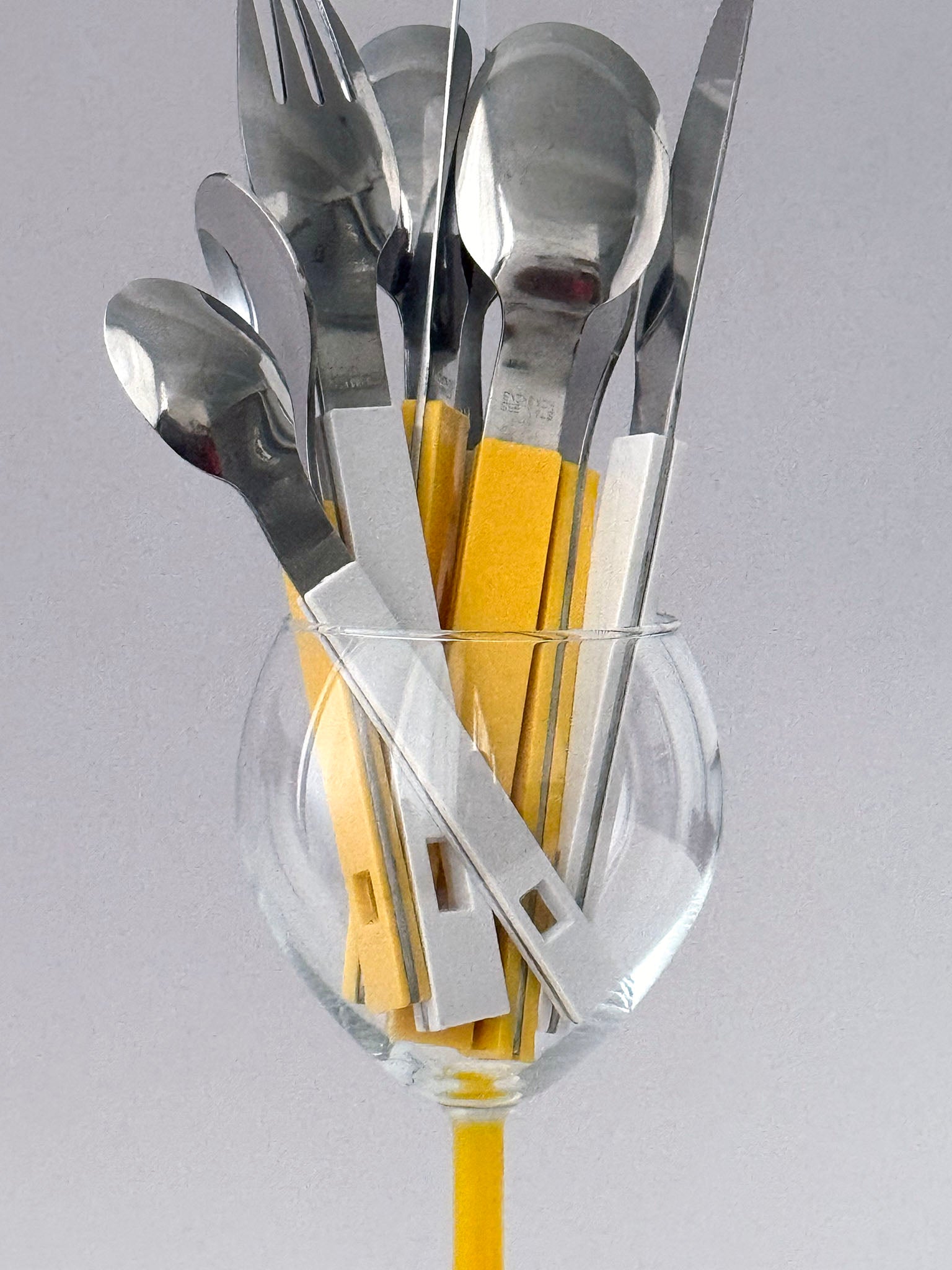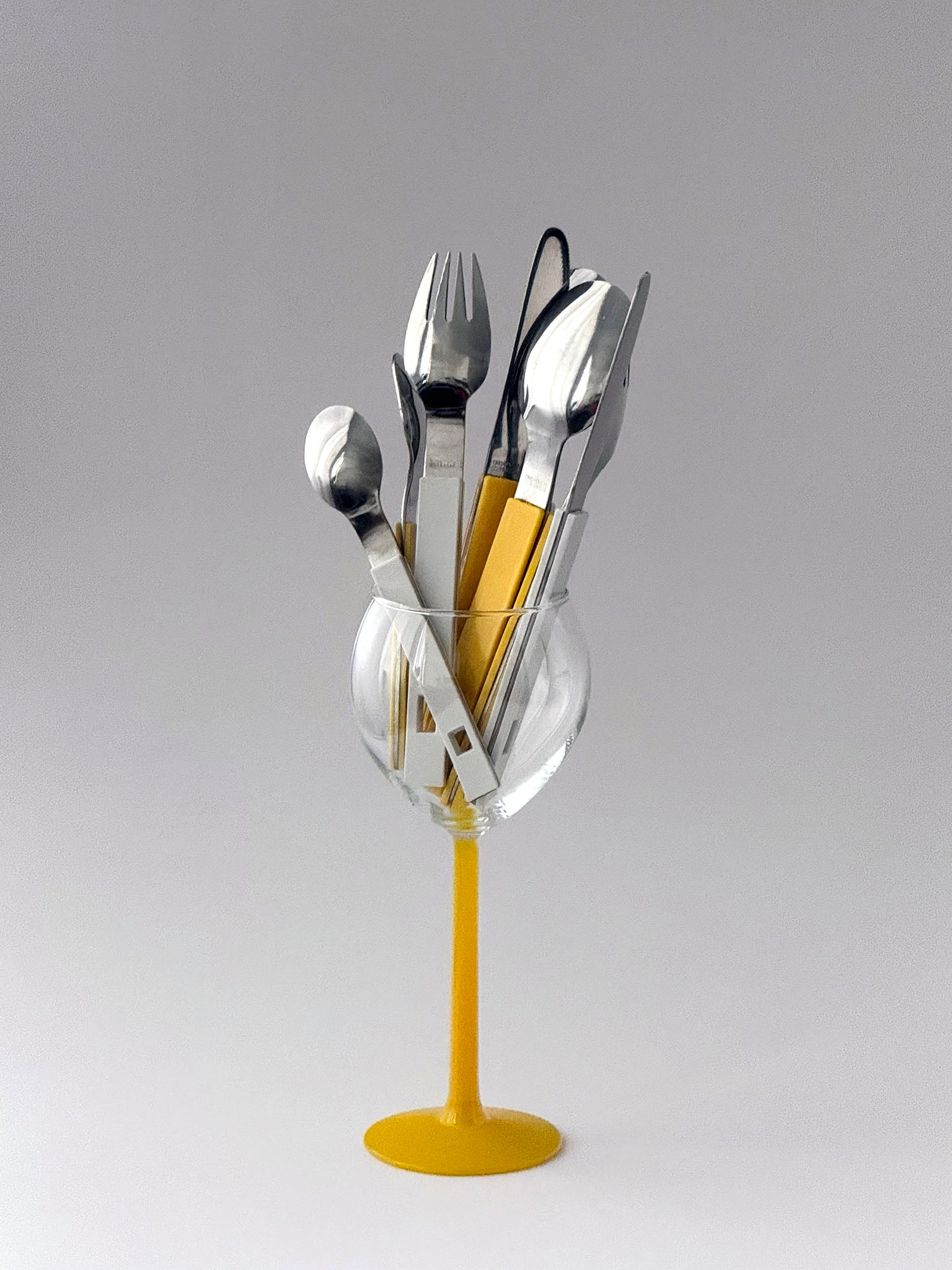 Primary yellow flatware set from the ’80s. Suitable for both adults and children.